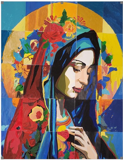 Each student contributed by painting an individual section of the mural in acrylics, infusing their unique style and creativity into the work. When assembled, these pieces formed a harmonious composition, rich with vibrant colors, varied textures, and distinctive styles of each student. Through this shared creative endeavor, the students not only honored Mary’s image but also reflected on her example of love and grace.