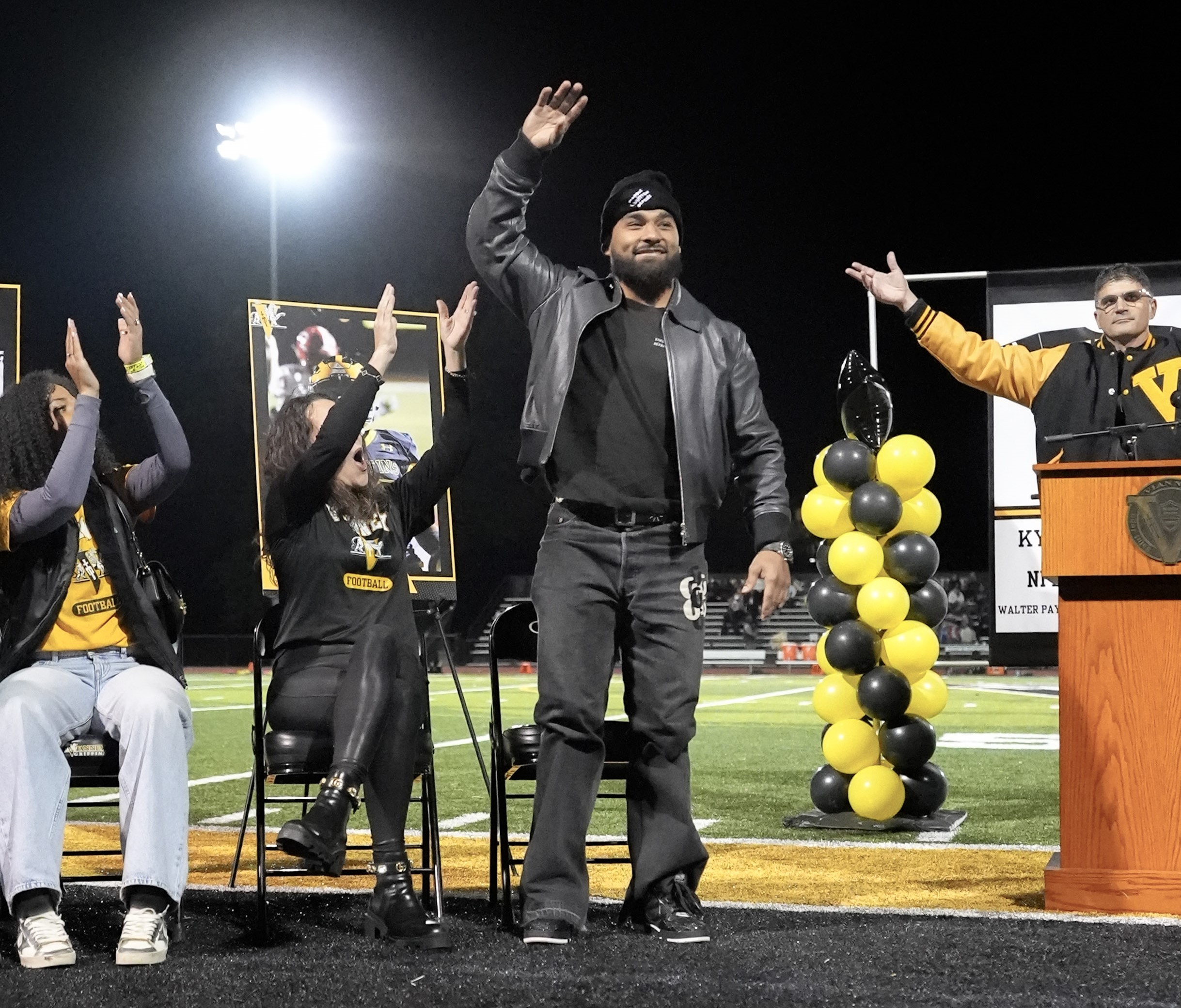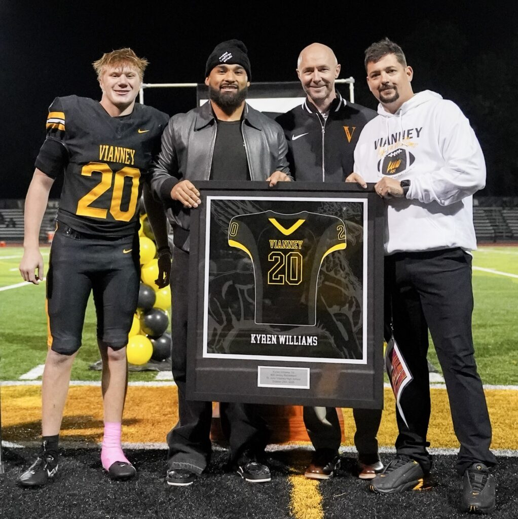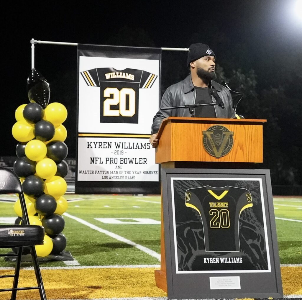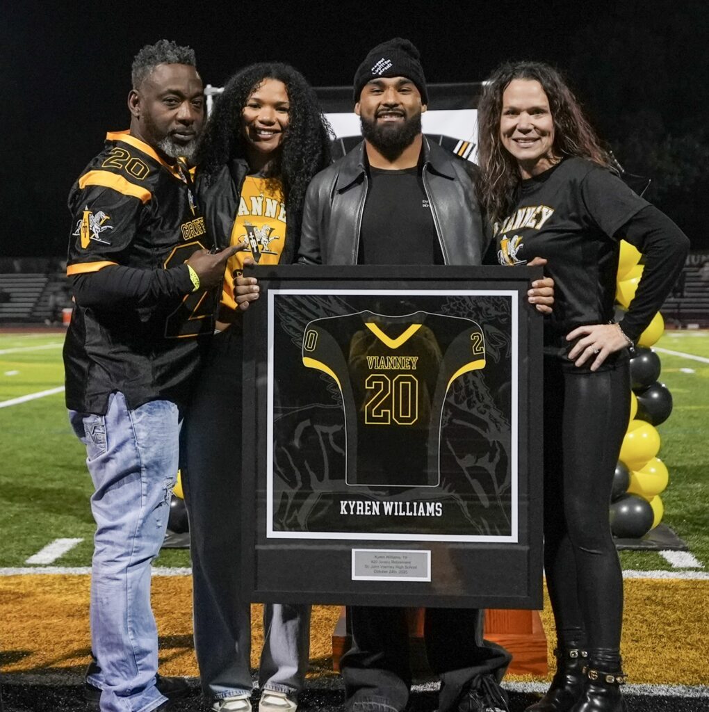 During the jersey retirement ceremony, Kyren was joined by Vianney President Ian Mulligan, Athletic Director Mike Potsou, and Head Football Coach Chris Starkey along with his family, friends, and teammates in the stands.