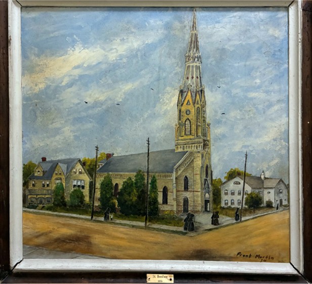 Most of the smaller Mass related items that we would have been interested in had already been divided up among the other parishes in Manitowoc. We marveled at the beautiful statues of St. Patrick, St. Boniface, the Blessed Virgin Mary, St. Anne and Mary etc. which were standing around the front altar, along with the beautiful stained-glass windows, intricate carvings on the wooden pews, and metal work shaped like harpsichords on music stands. As we were leaving, several paintings were standing near the doorway. One was a painting of St. Boniface Church. A metal plate at the bottom dated the image as 1886 when our Sisters would have been teaching there. Mother Gabriel taught the St. Boniface school children already in 1868 before Father Fessler built the first convent/school combination in 1869.