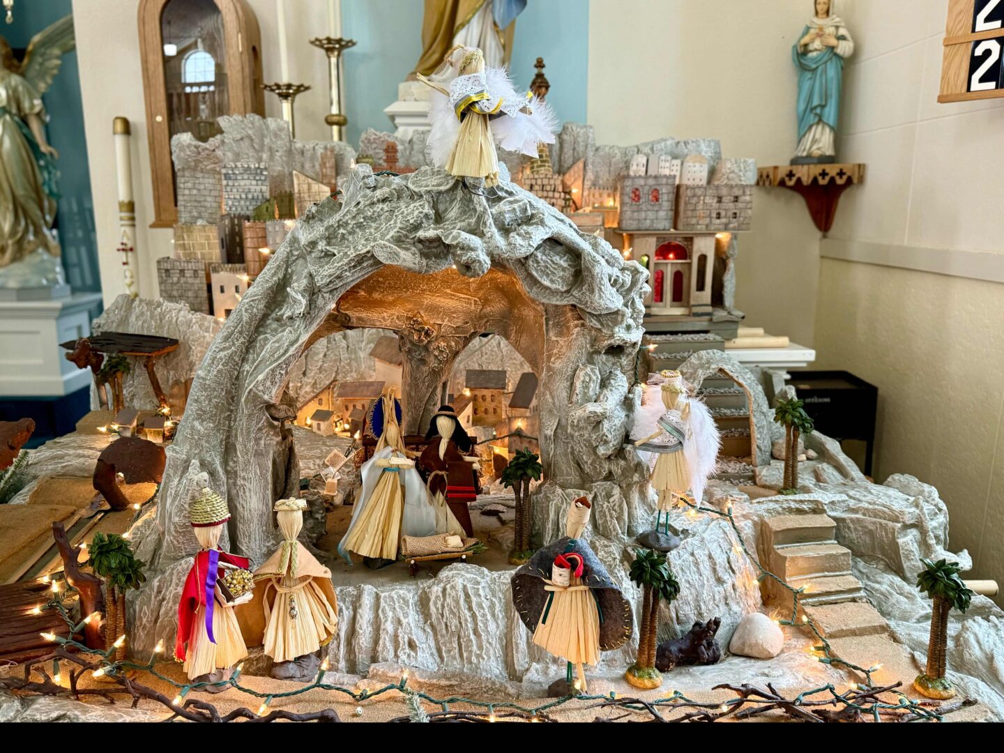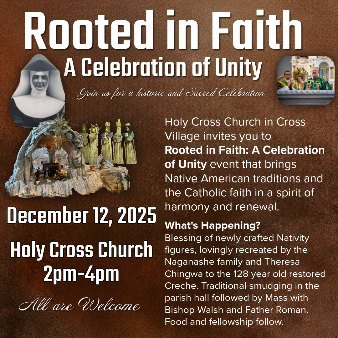 Holy Cross Church, Cross Village, Michigan sent Franciscan Sisters of Christian Charity an invitation to a “Rooted in Faith Celebration of Unity”, December 12, 2025. Why were we invited? In 1897 one of our Sisters, Sister Loyola Gremminger crafted a memorable creche out of a tree stump for the parish. Although Sister served twenty years among the people quite a long time ago, the creche continues to be part of the parish’s Christmas celebration today. The event was certainly one we had all hopes of accepting. Our only sadness as the day neared was our inability to be present because of winter weather conditions.